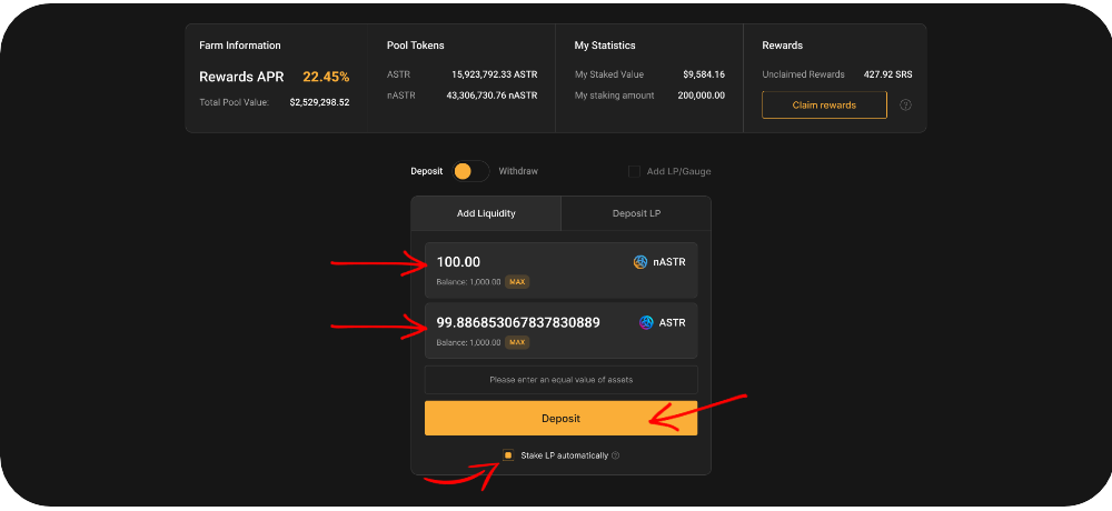 * Entrez la quantité de nASTR et d'ASTR que vous souhaitez fournir ;