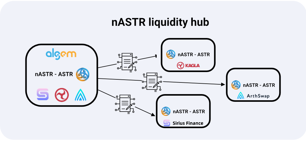 Фарминг nASTR - который мы ранее называли nASTR Liquidity Hub - представляет собой группу промежуточных контрактов, которые улучшают пользовательский опыт, позволяя держателям nASTR взаимодействовать с другими протоколами для использования своих токенов nASTR непосредственно на Algem.